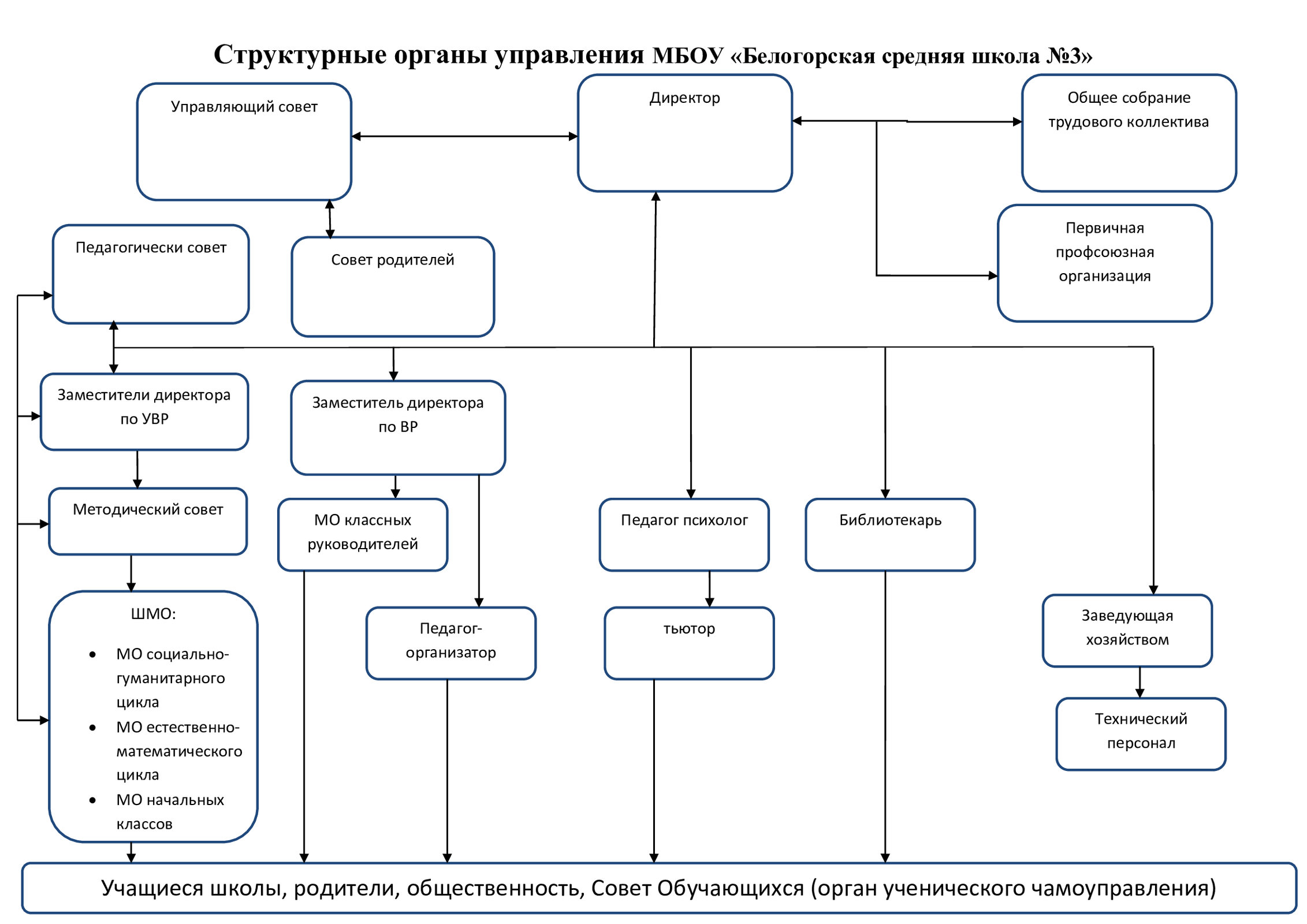Система управления Муниципального бюджетного общеобразовательного учреждения «Белогорская средняя школа №3» Белогорского района Республики Крым (далее – Школа) представлена в Уставе Школы. Единоличным исполнительным органом Образовательной организации является руководитель Образовательной организации – директор, который осуществляет текущее руководство деятельностью Школы. Директор назначается на должность начальником Управления образования по согласованию с Главой Муниципального образования Белогорского района Республики Крым, Главой Администрации и Министром образования, науки и молодежи Республики Крым, в порядке, установленном действующим законодательством Российской Федерации и Республики Крым. В соответствии с Уставом Муниципального бюджетного общеобразовательного учреждения «Белогорская средняя школа №3» г.Белогорска Республики Крым в Школе действуют следующие коллегиальные органы управления:
